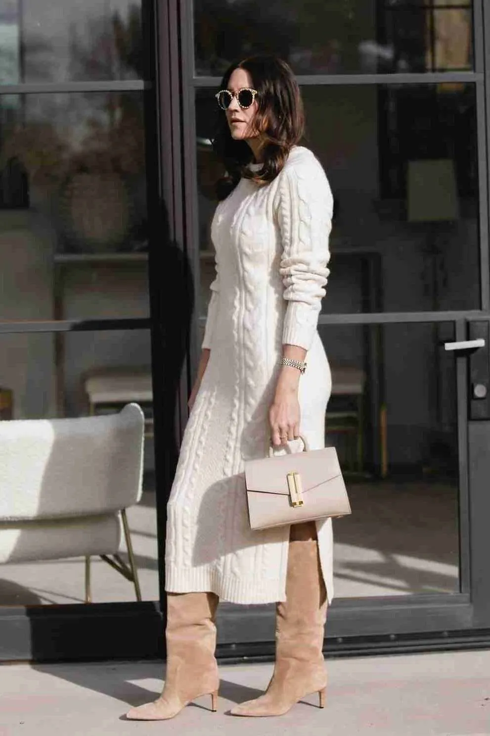 A shorter sweater dress paired with high boots creates a clean, elongated line. I’m loving the cable knit texture on this dress as well. This look feels elevated and is ideal for colder days when you want warmth without layering too much.