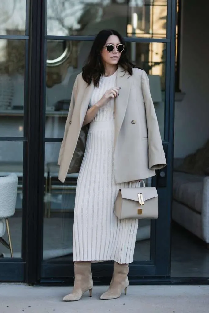 From cable knit minis to sleek ribbed silhouettes, dresses and boots create outfits that feel wearable, elevated, and overall seasonally appropriate. This combination works especially well when you focus on clean lines and neutral palettes.