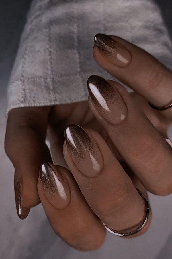 The brown chrome nail look is still very much in favor, and it’s adapted over the years to include softer tones, minimalist accents, and more wearable finishes. You can still go bold with deep chocolate chrome, but 2025 is also seeing lighter latte-chrome looks and glaze-tones as well as more intentional accent nails.