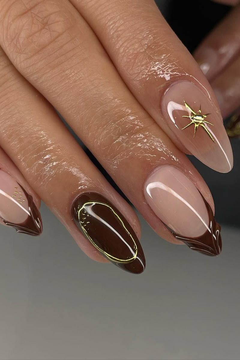 Pairing brown chrome nails with gold accents creates a luxe and sophisticated look. For example, think thin gold lines, delicate foil details, or subtle embellishments that highlight the chrome finish beautifully. This combo gives off a warm, elegant vibe, so ideal for the fall season and special occasions.