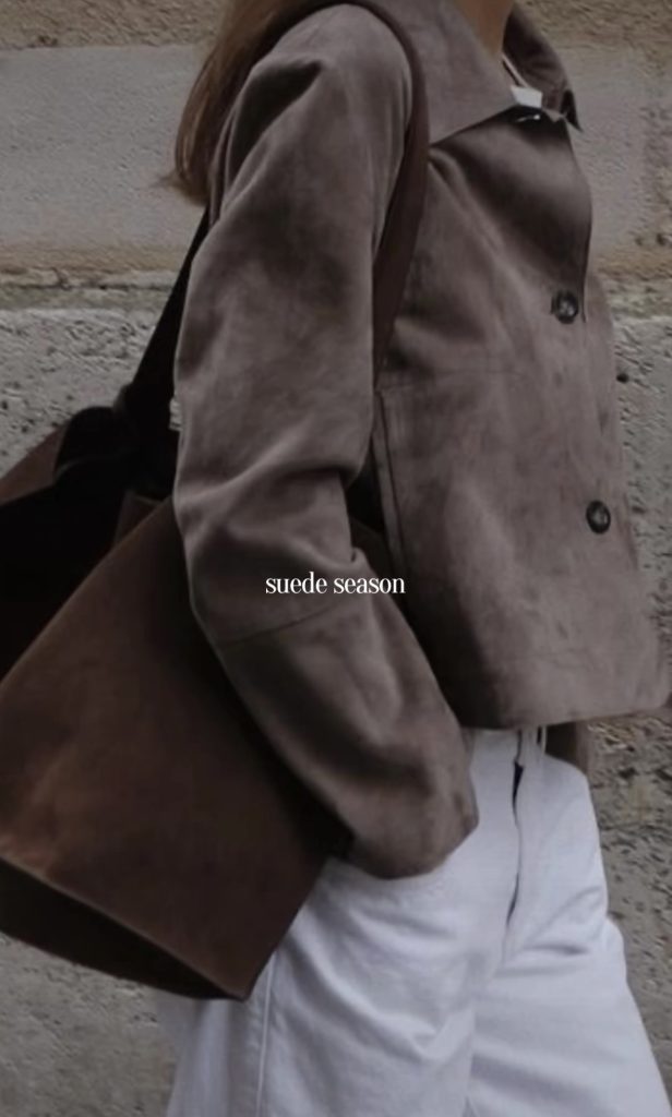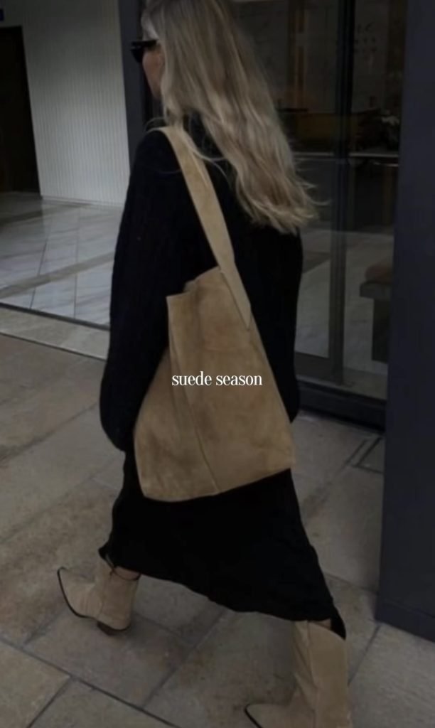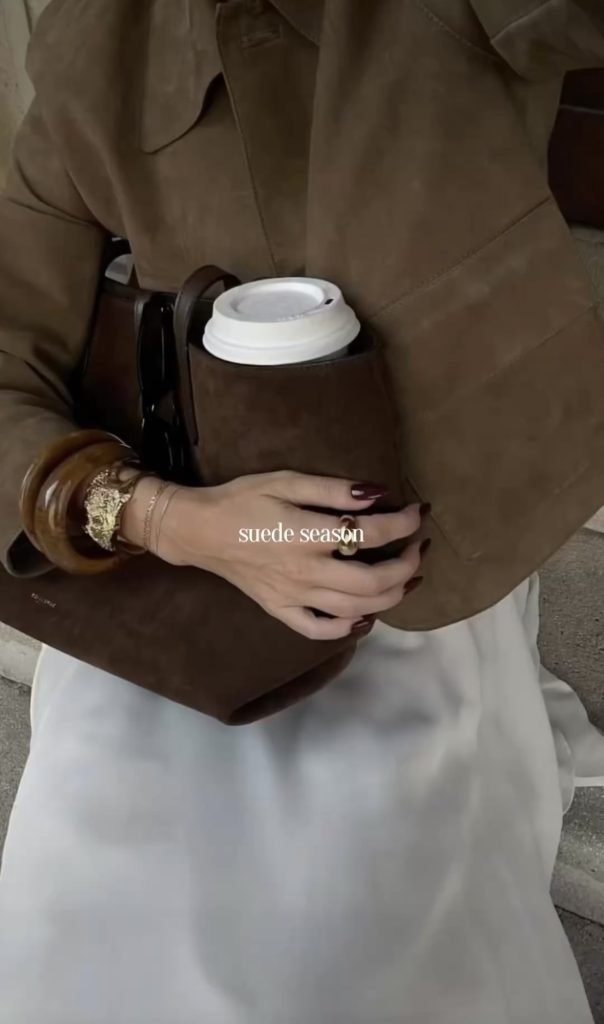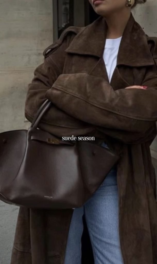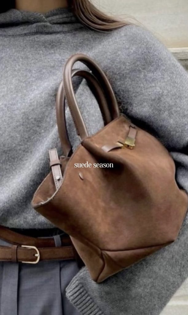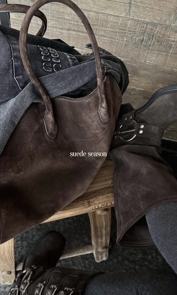 Suede bags are the perfect accessory to add a touch of fall and winter texture to any look. Whether you’re carrying a structured top-handle, a slouchy shoulder bag, or a chic crossbody, suede instantly brings warmth and richness to your outfit. It’s an effortless way to elevate even the simplest jeans-and-sweater combo. And a timeless material that feels especially luxe during the colder months.