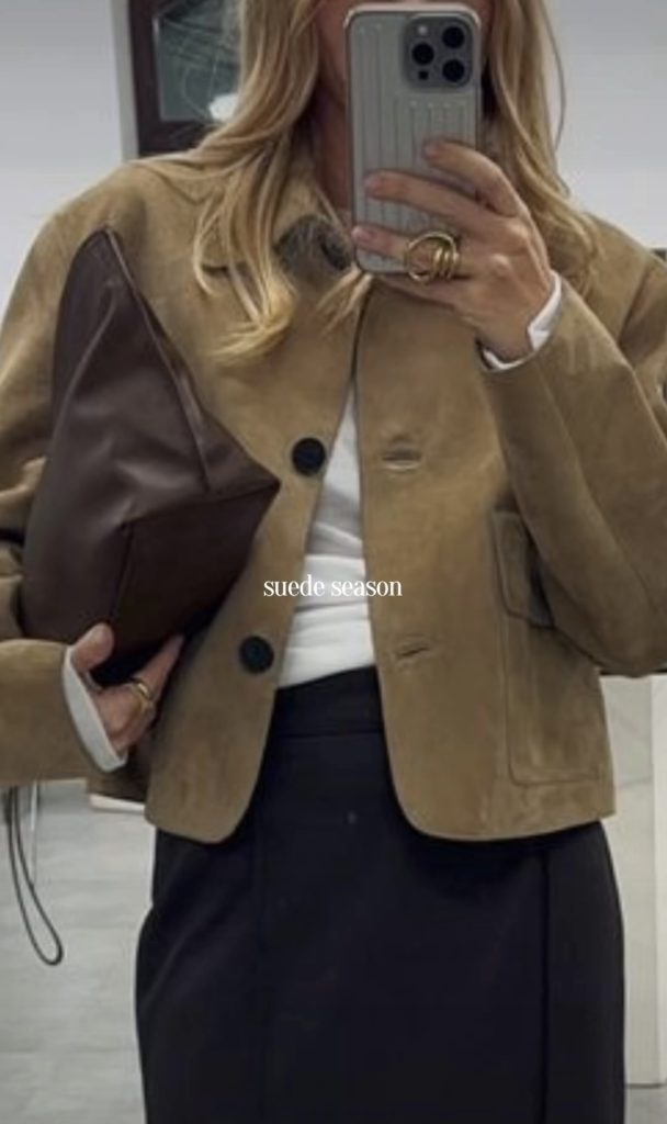 A suede jacket is one of those timeless pieces that never loses its appeal. And the cropped silhouette feels especially fresh for fall. Lightweight and easy to layer, a cropped suede jacket is perfect for those in-between days before the temperatures really drop. For example, style it with a skirt for a feminine look, pair it with trousers for something polished, or keep it effortless with your favorite jeans. It’s overall a versatile staple that instantly elevates any outfit.
