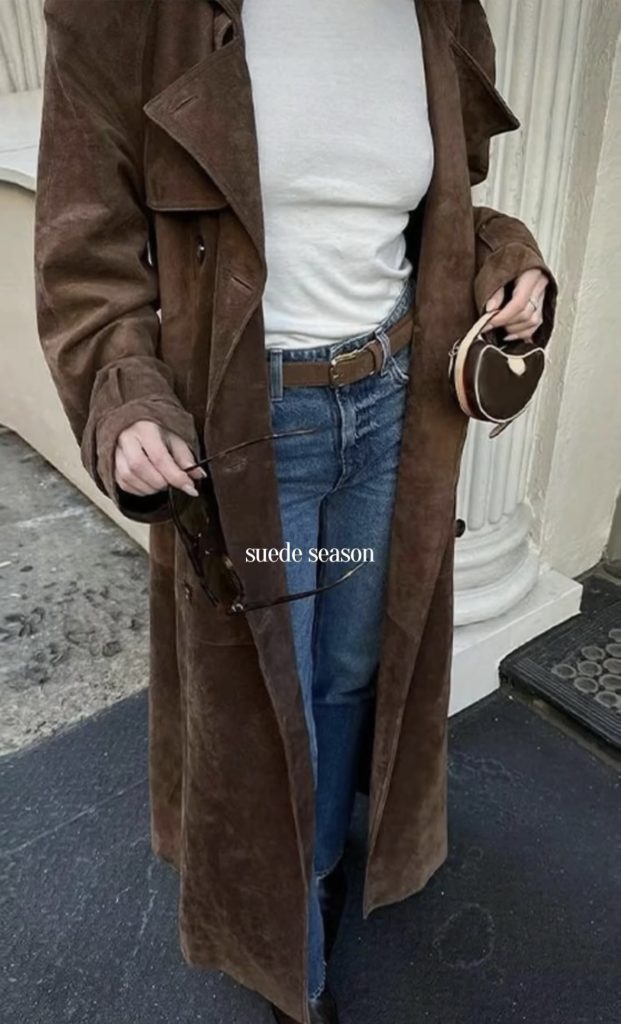 A suede trench coat is one of the most timeless ways to bring this luxe texture into your fall and winter wardrobe. It’s an overall investment piece that truly lasts forever, adding effortless sophistication to anything you wear. Style it over a dress for a chic date night look, layer it with jeans for a casual day out, or pair it with tailored trousers for work. No matter how you wear it, a suede trench instantly elevates your outfit.