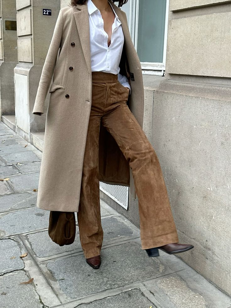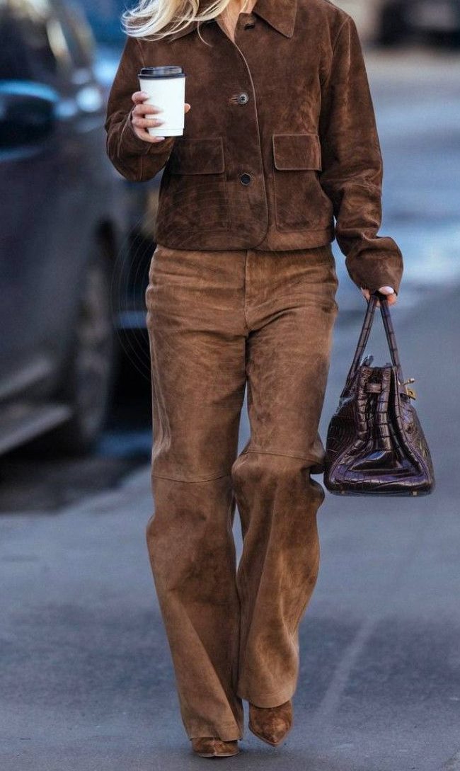 Suede pants are bold yet timeless, making them a standout piece for fall outfits. For a fashion-forward look, you can go all out with a full suede moment by pairing suede pants with a coordinating jacket. This is a so chic and modern take on tonal dressing. Also, for something more classic, style your suede pants with a crisp white button-down, leather boots, and a structured trench coat for the office. Whether you’re dressing them up or keeping them casual, suede pants outfits offer endless styling possibilities.