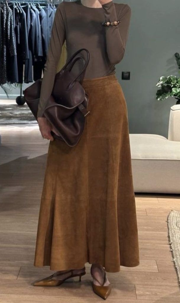 Suede skirts, whether midi, maxi, or mini, are always a chic choice for fall. A suede maxi skirt paired with heels and a cozy sweater makes a sophisticated workwear look. It feels so elevated and timeless. Also, for something more fun, style a suede mini skirt with tights and boots for a chic date night outfit. No matter the length, a suede skirt adds so much beautiful texture and warmth to your fall wardrobe.