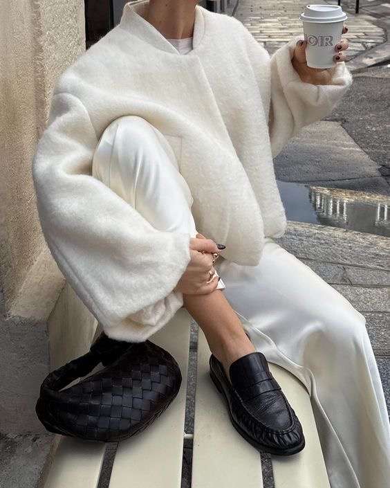 For contrast, Cloud Dancer pairs especially well with deeper grounding shades. Espresso brown, chocolate, charcoal, and muted black add depth while keeping the palette refined. These combinations feel timeless and are some of the easiest to wear on repeat.