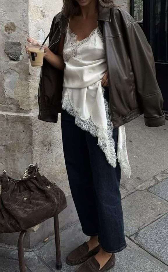 This layered look is perfect for everyday wear. Start with a lace cami, add your favorite straight or slim jeans, then layer a chic jacket on top.