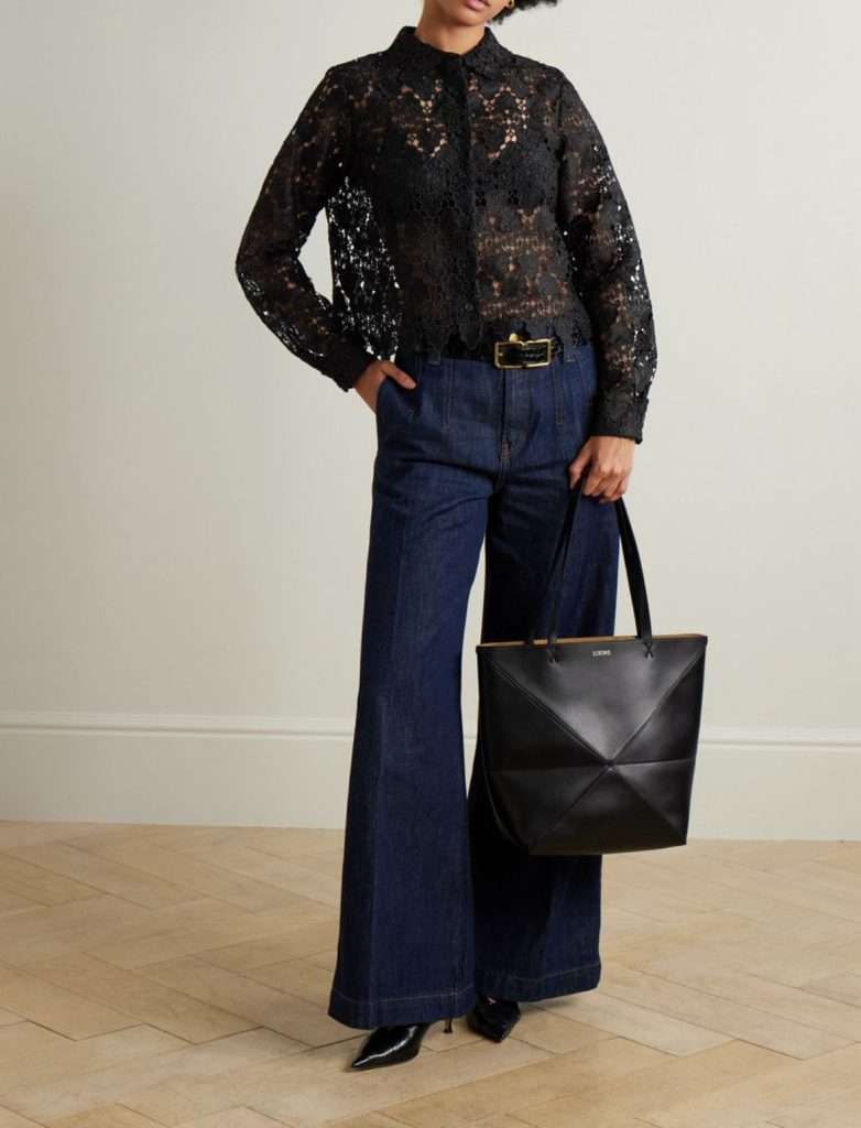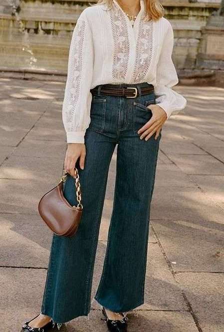 For a more fashion forward silhouette, try a lace blouse with wide leg denim. This combination feels very current while still staying classic.