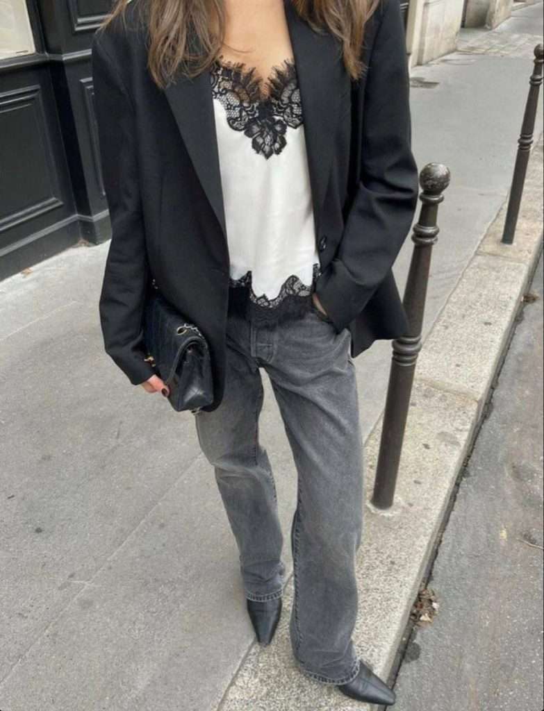 Layering is one of my favorite ways to make denim with lace outfit ideas feel more styled. A tailored blazer over a lace top with jeans instantly elevates the look. A denim jacket over a lace cami keeps things relaxed but still feminine.
