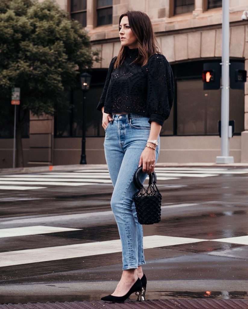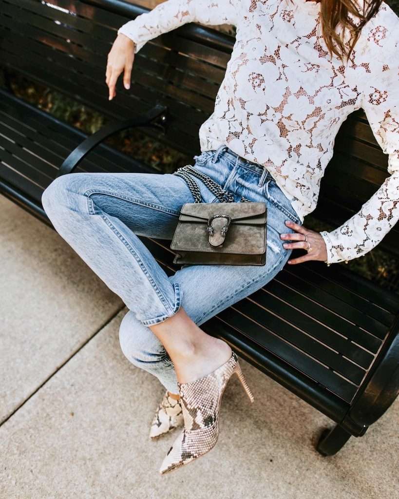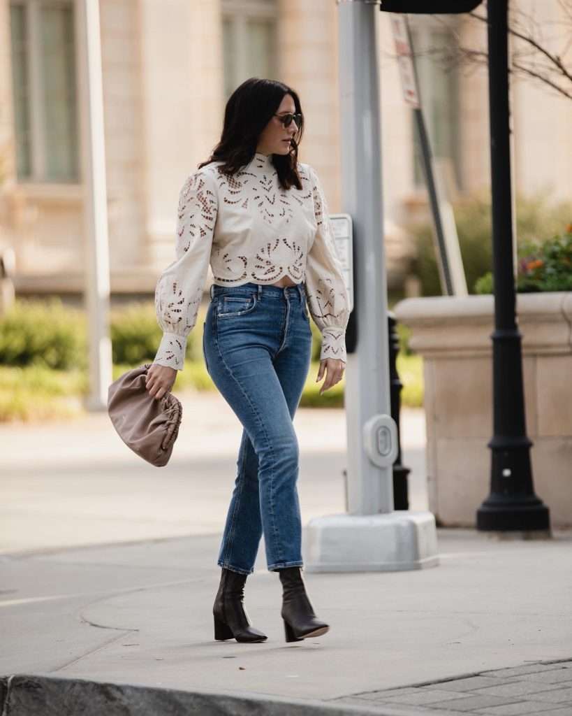 For a softer daytime look, a cream lace blouse with denim in a light wash feels relaxed but still polished. I love this combination for spring and summer styling.