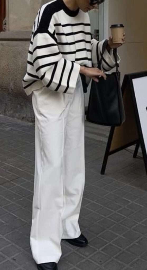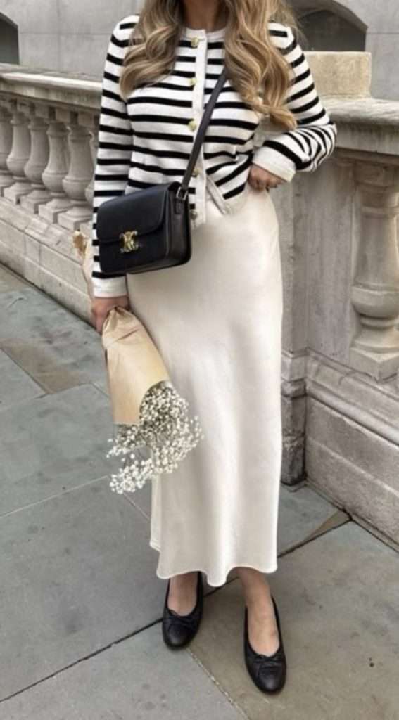 Black and white stripe outfits are such a classic go-to for February when you want to look put together without trying too hard. A striped cardigan or sweater instantly feels timeless and chic. Especially when styled with straight leg jeans, a sleek black skirt, or even a midi for a more elevated look. Keep the rest of the outfit simple with neutral accessories like black boots, loafers, or a structured bag. This will help let the stripes shine. It’s an easy way to recreate that effortless, classy vibe that works for everyday wear all month long.