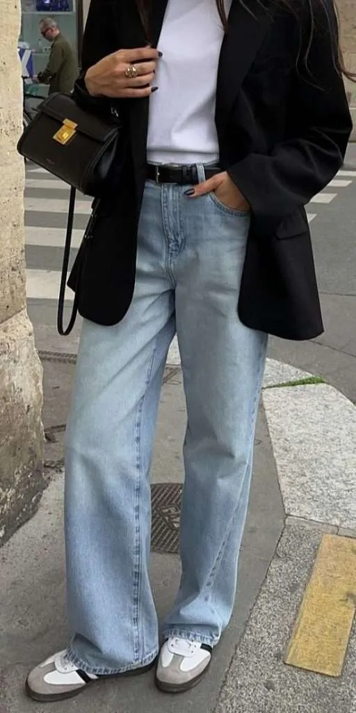 Start with a structured neutral blazer layered over a clean white or ivory tee. Then, pair it with straight leg denim in a medium or dark wash and finish with loafers or sleek sneakers.