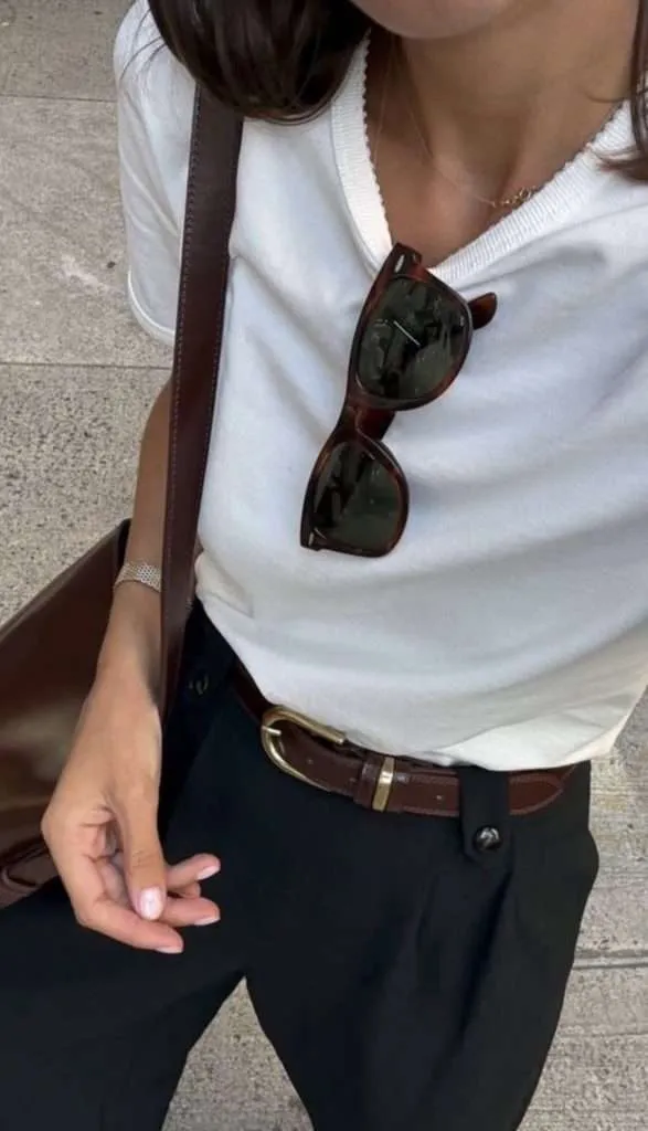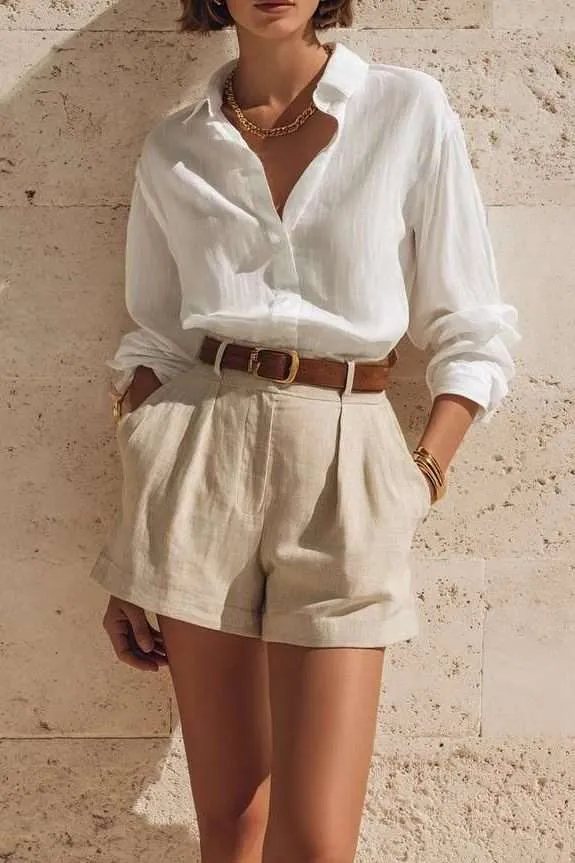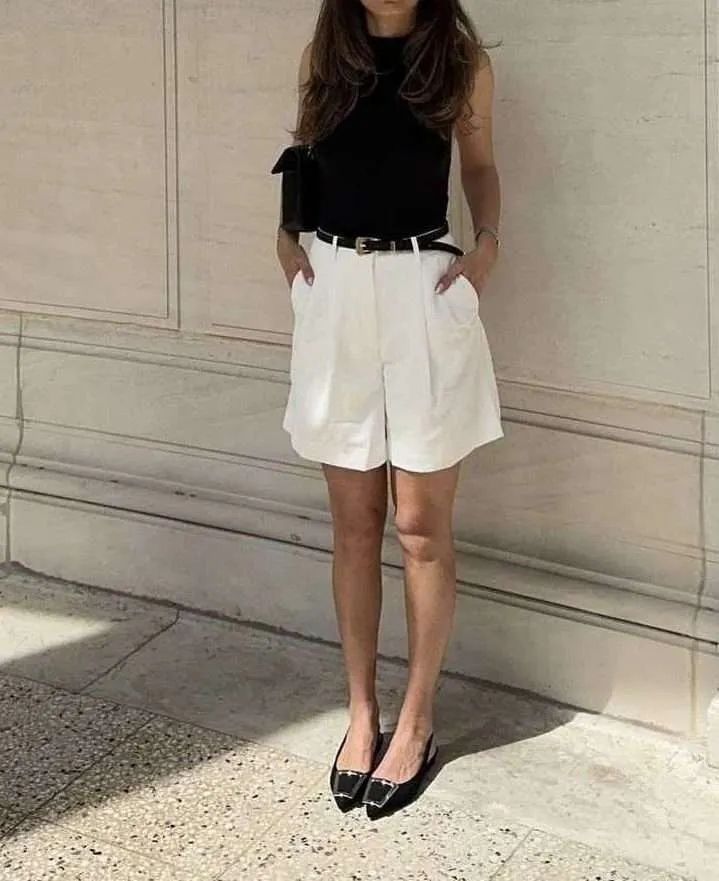Also, in spring and summer, pair a soft neutral blouse with tailored shorts in linen or structured cotton. Then, finish with minimal sandals.