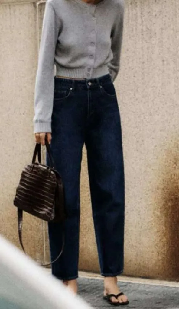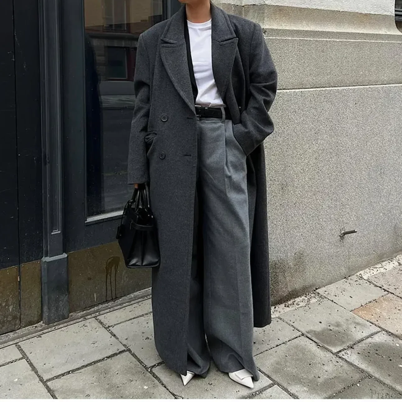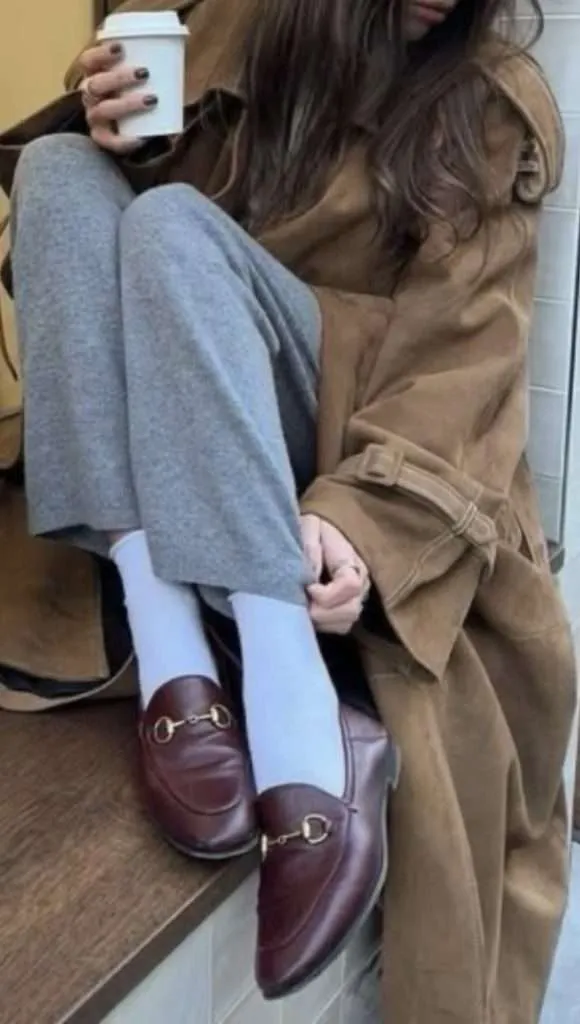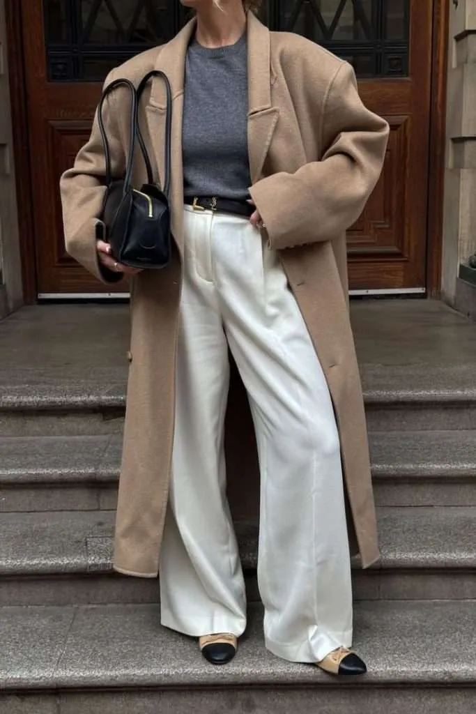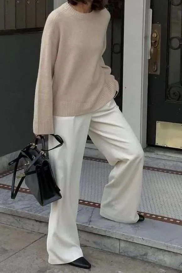 For a slightly more elevated look, pair a soft neutral knit sweater with tailored wide leg trousers. Then, add minimal flats or low heels and a structured handbag.
