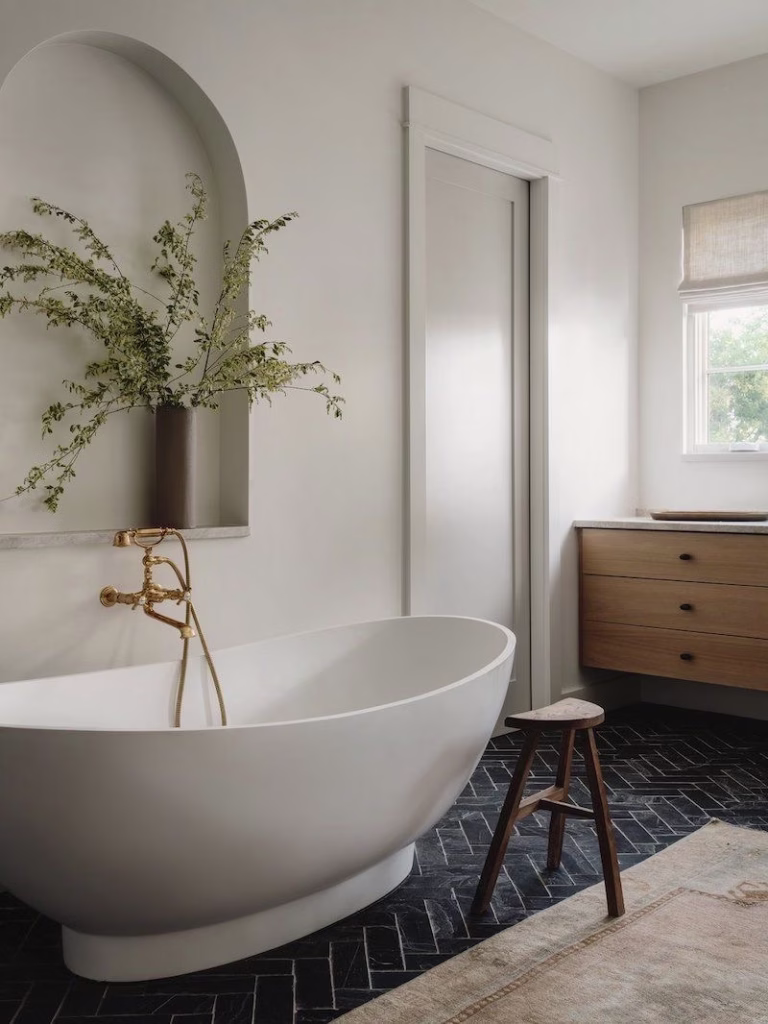 Stone or textured tile helps ground the space. Instead of bold patterns, focus on subtle variation and natural movement. This creates visual interest while still keeping the overall look calm and minimal.