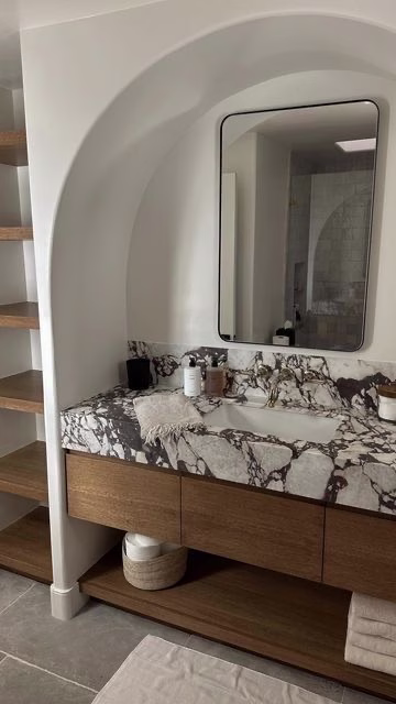 This style thrives on restraint. Rather than filling your countertops, choose a few pieces that feel intentional — a ceramic tray, a neutral soap dispenser, or a sculptural object. Less truly feels more here.