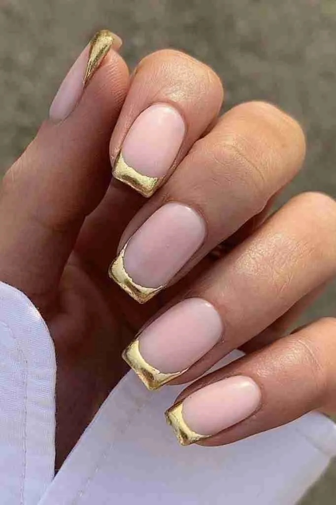 Touch of gold nails are a chic way to elevate a January manicure while still keeping things clean and refined. Subtle details like a gold French tip or delicate gold leaf add just enough shine without feeling overdone. For a bolder option, a soft gold all-over nail looks polished and elegant, especially paired with short, classic shapes. Gold accents feel timeless and are perfect for adding warmth and luxury to winter nails. If you’re loving metallic nails this season, check out my metallic nail ideas blog post here for more inspiration.
