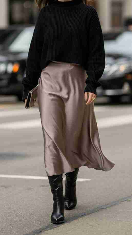 This is one of my most worn combinations. A neutral satin skirt paired with a soft cashmere sweater feels cozy yet elevated. Then, add boots or ballet flats for an effortless, everyday look.