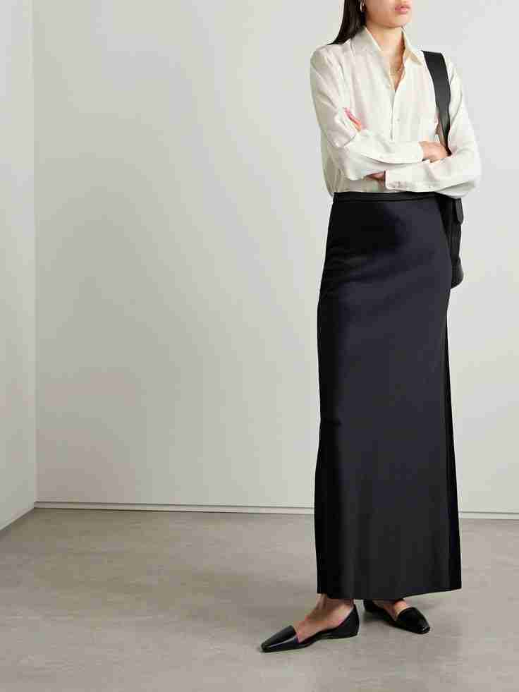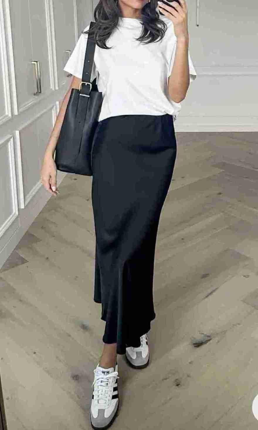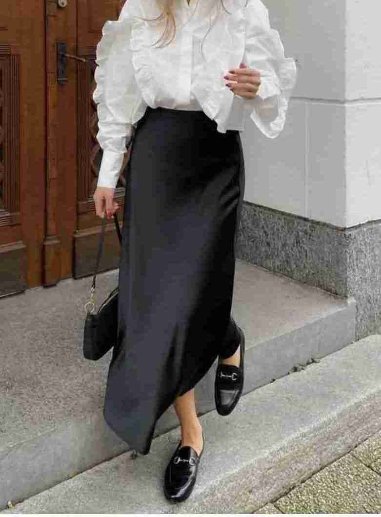 Let the silk skirt be the star. Clean accessories and neutral tones help keep the outfit looking polished rather than busy.