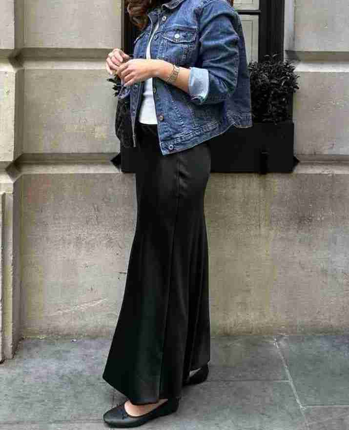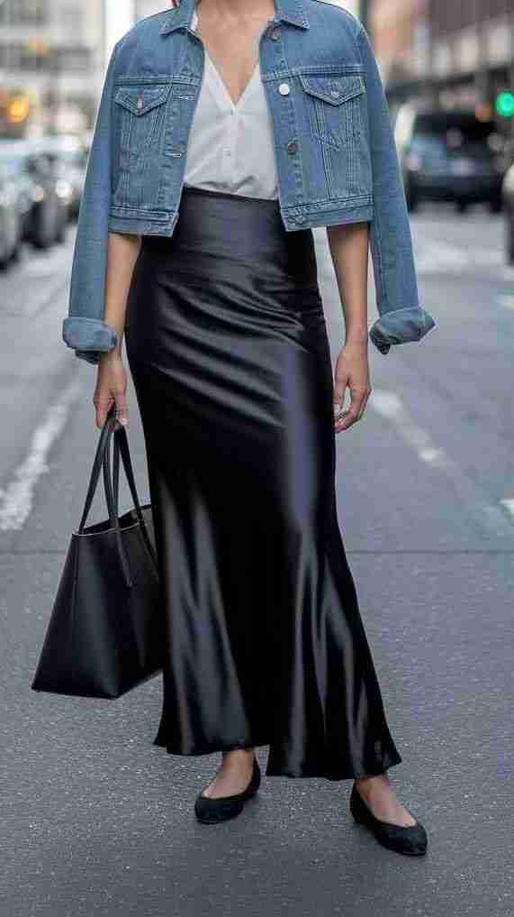 A denim jacket adds structure and makes a silk skirt feel overall more casual and approachable. This is an easy everyday outfit that still feels pulled together.