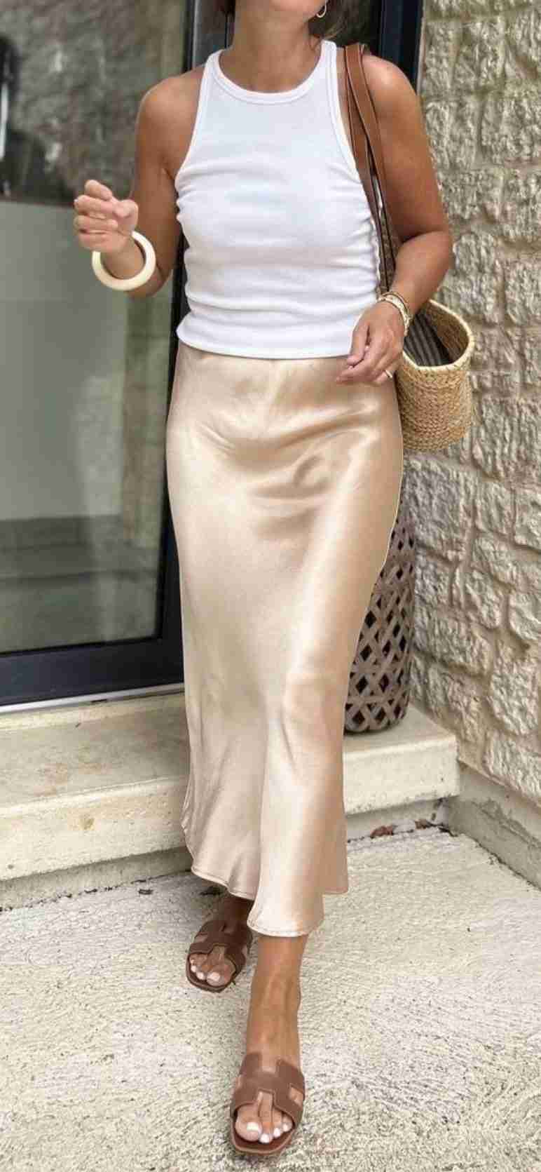 For warmer days, a simple tank top and sandals let the satin skirt shine. Keep everything neutral for a timeless look.