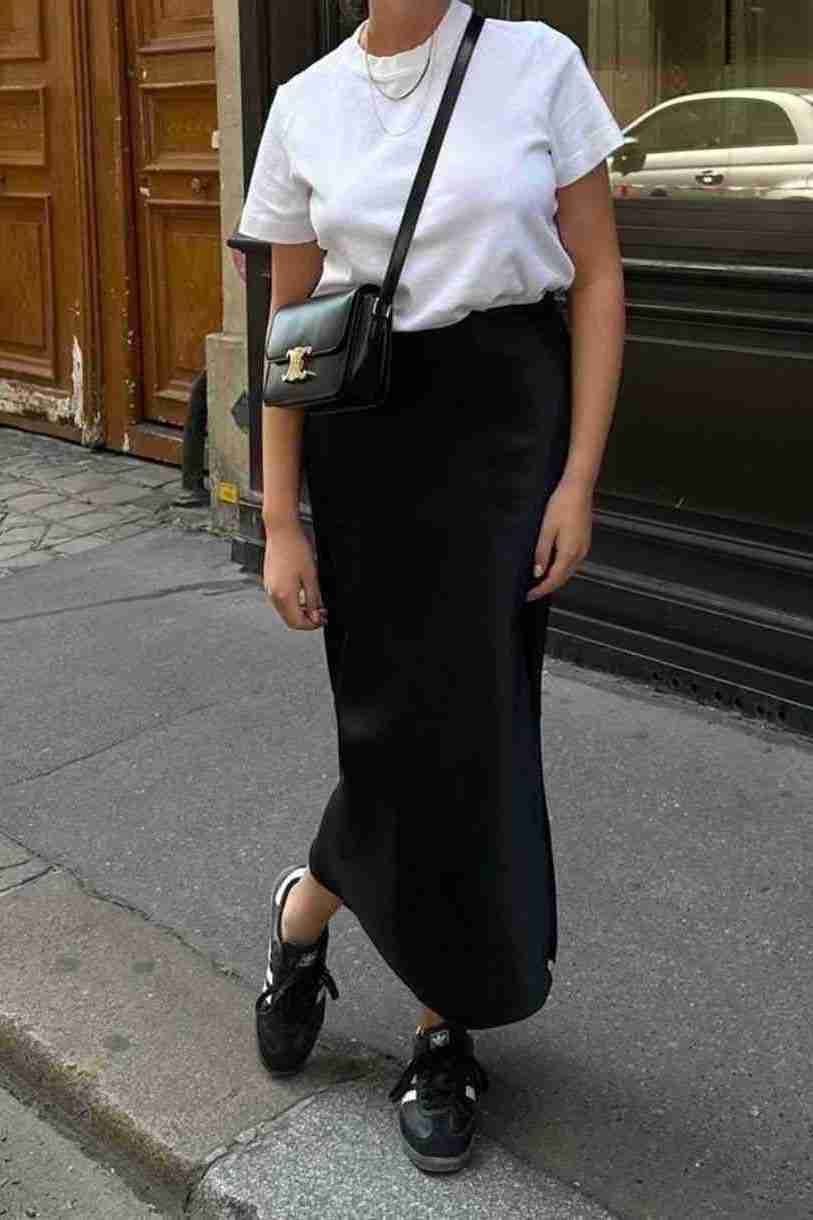 An easy way to make a silk skirt feel casual. The fitted tee balances the fluidity of the skirt, while sneakers keep it grounded and wearable.