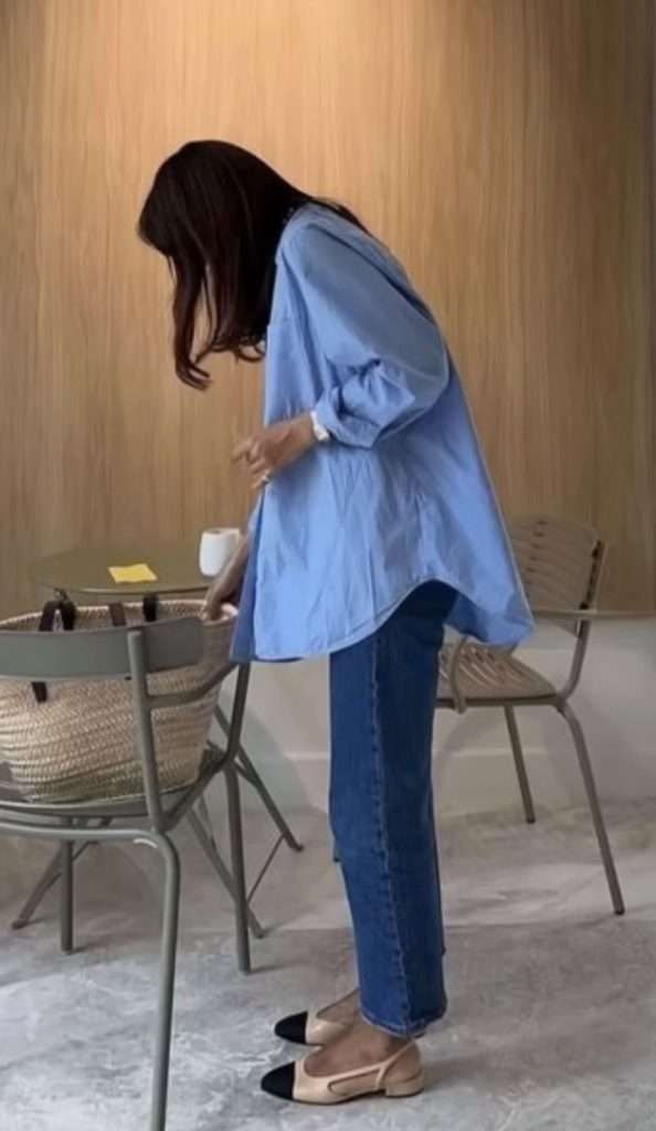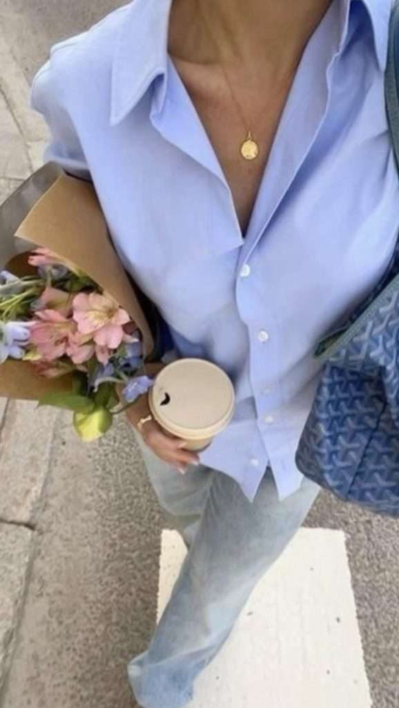 Blue button down outfits are a great way to transition into early spring with a fresh pop of color. For those cooler days, layer your button down over a long sleeve tee for extra warmth. Pair it with classic jeans and your favorite sneakers for a laid back vibe, or swap in ballet flats for a more polished look. You can also add a denim jacket to add more layers to the look. This combo is easy, stylish, and perfect for that in between weather when it’s not quite winter but not fully spring either!