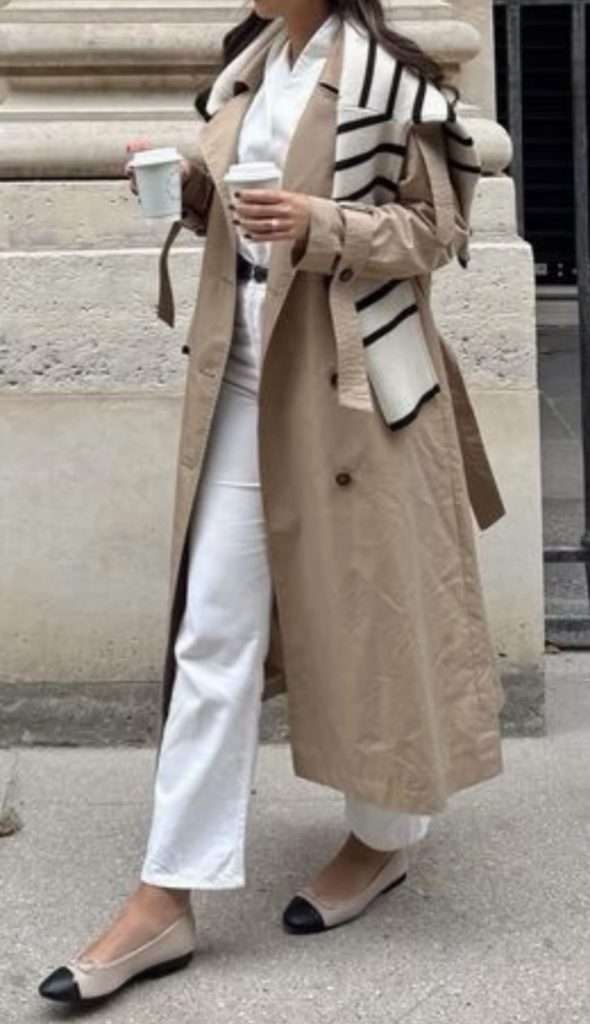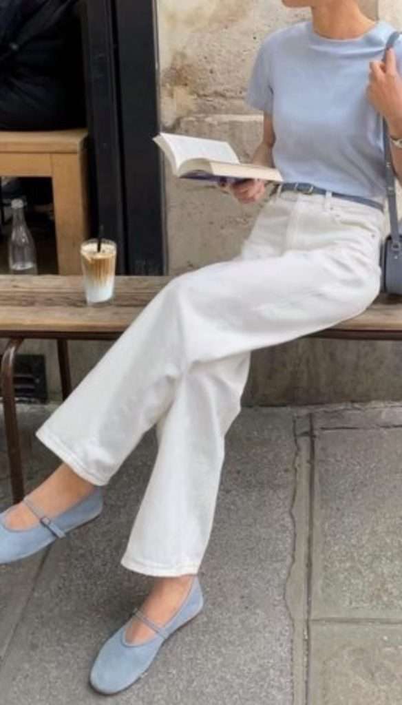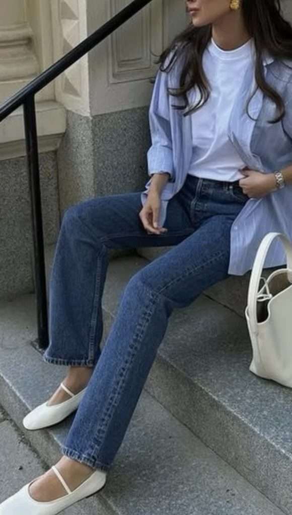 White jeans outfits are such a chic way to transition from winter into spring. They instantly brighten up your look while still feeling polished. Pair them with a classic trench coat, a soft blue sweater, and ballet flats for an effortless, put-together outfit that feels fresh but still seasonally appropriate. It’s simple, timeless, and perfect for those in-between days.