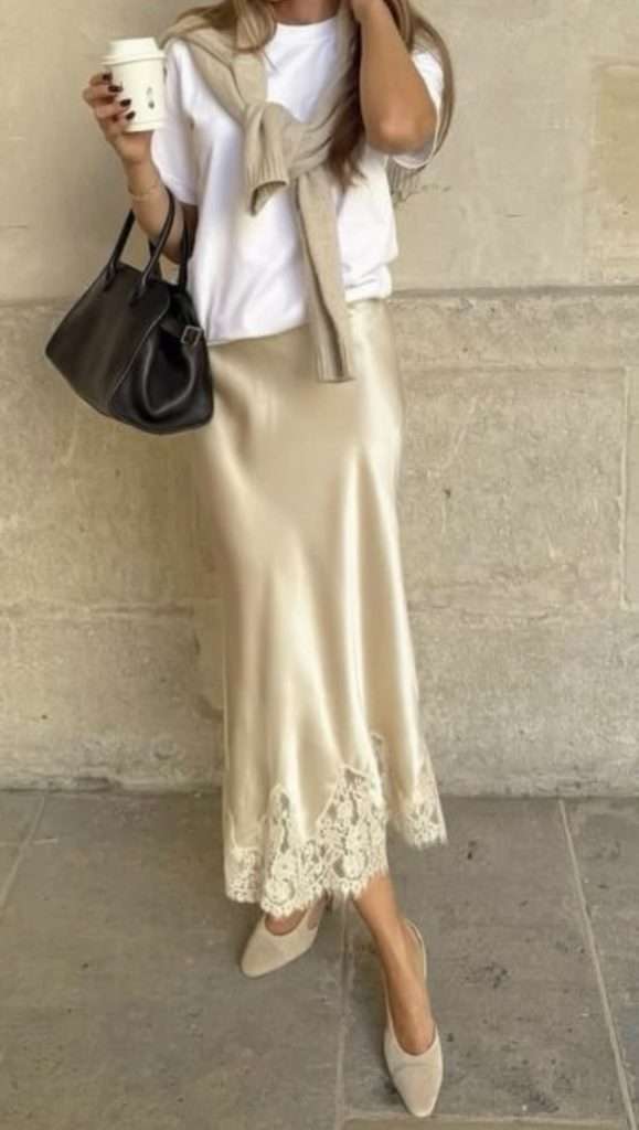 White skirt outfits are perfect for transitioning from winter to spring. Pair a white skirt with a cozy sweater and boots to stay warm during chilly days. As the weather warms up, swap the boots for ballet flats for a lighter, more spring-ready look. It’s a versatile piece that feels fresh and stylish no matter the season!