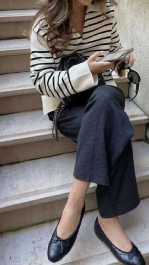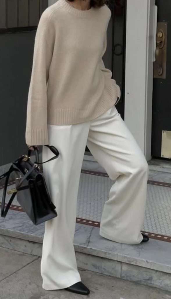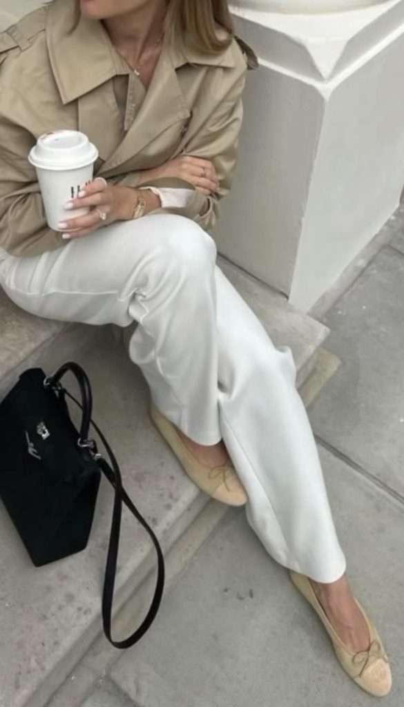 A white trousers and ballet flats outfit is a great way to ease into early spring. White trousers add a fresh, light touch that feels perfect for the changing seasons. Pair them with a cozy sweater for warmth, and layer a simple tee underneath for those days when the sun decides to peek out. Layers are perfect for transitional times, and swapping your winter boots for chic ballet flats gives the outfit a more spring-ready vibe. It’s an easy, stylish combo that works for both cool and warmer days!