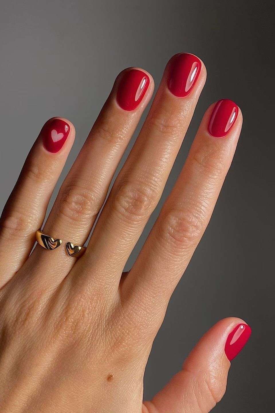 Short Red Nails with a Subtle Heart are perfect if you want something cute for Valentine’s Day but still super wearable. The short length keeps the look clean and effortless, while a tiny heart detail adds just the right hint of Valentine’s Day without feeling over the top. It’s a simple, classic red manicure with a sweet little twist that feels fun, casual, and easy to wear all week long.
