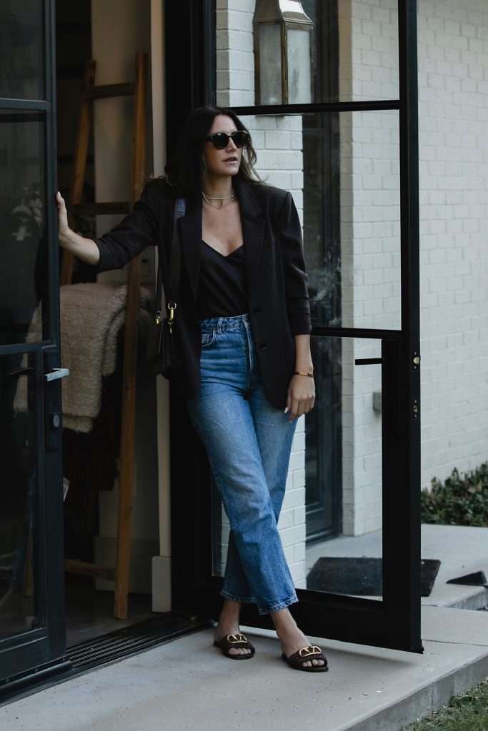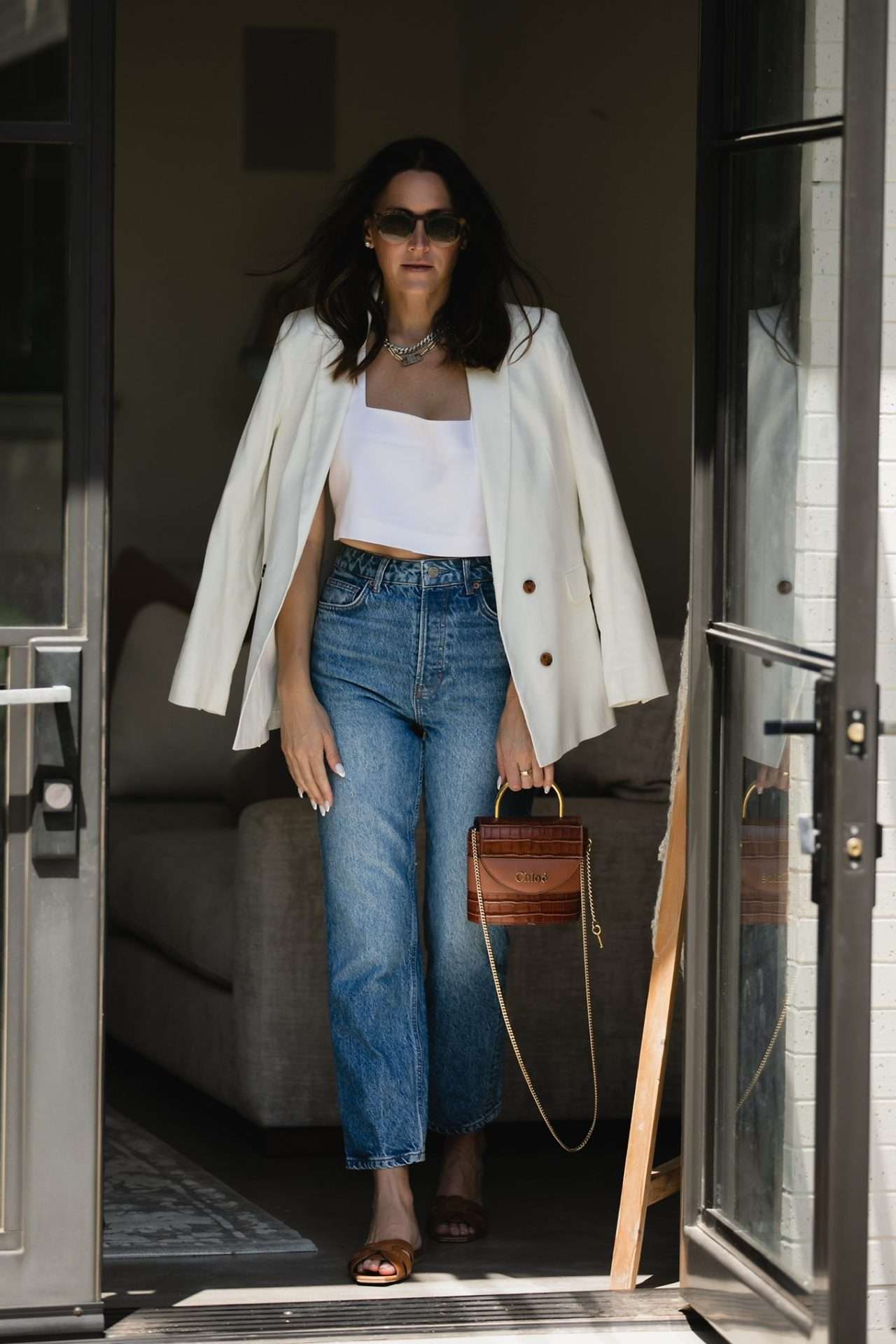 Straight leg denim with a white shirt and relaxed blazer is always a safe and chic choice. Sneakers or flats keep things approachable and comfortable.