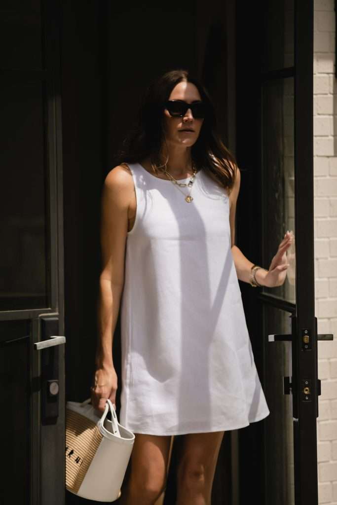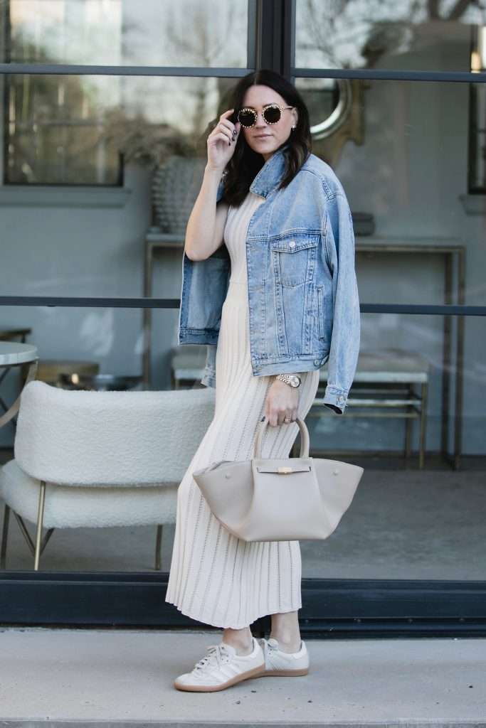 A relaxed dress styled with minimal sneakers keeps the look comfortable while still looking thoughtfully styled.