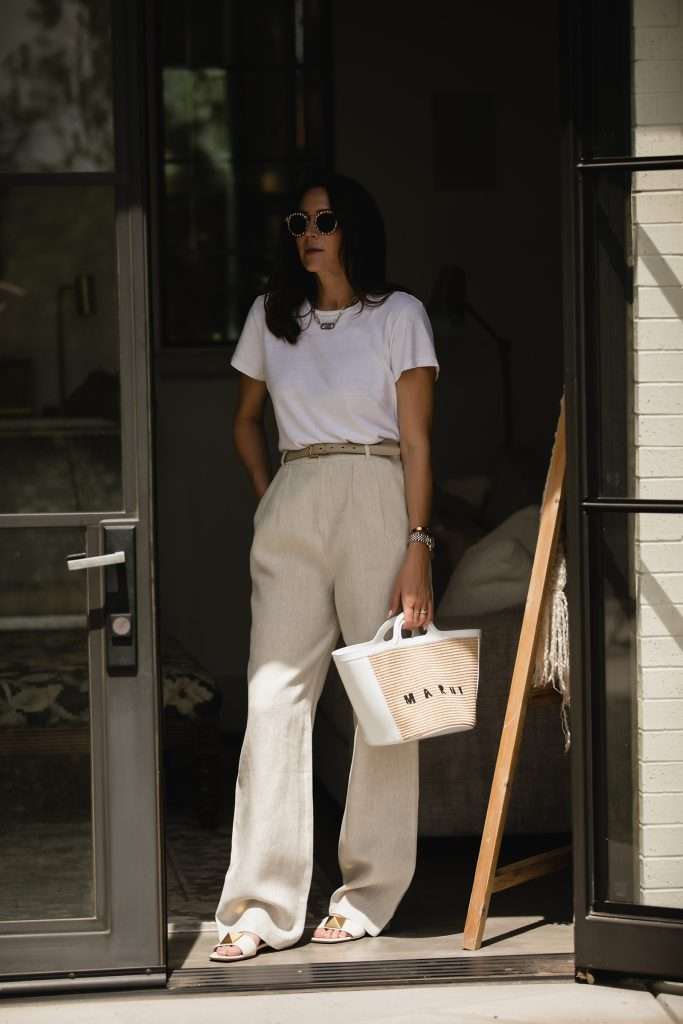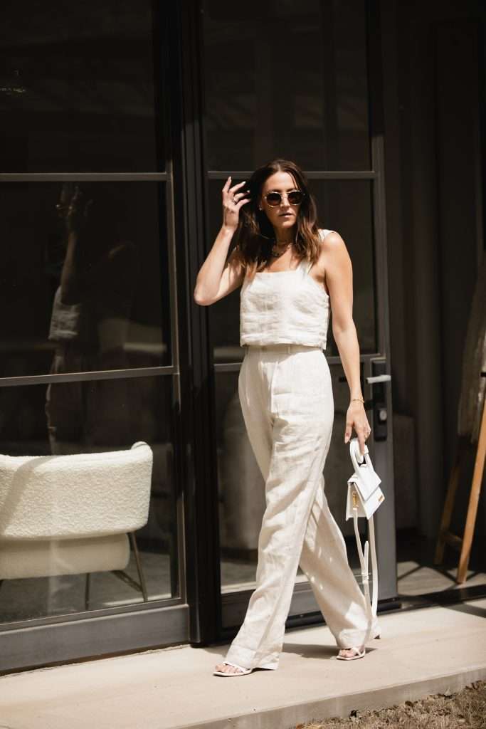 Linen pants styled with a simple tank or button down shirt are one of my favorite summer dinner looks. Also, if you need more ideas, I share additional styling tips in my guide on how to wear linen pants here. Finish with sandals and woven accessories for a relaxed yet elevated outfit.