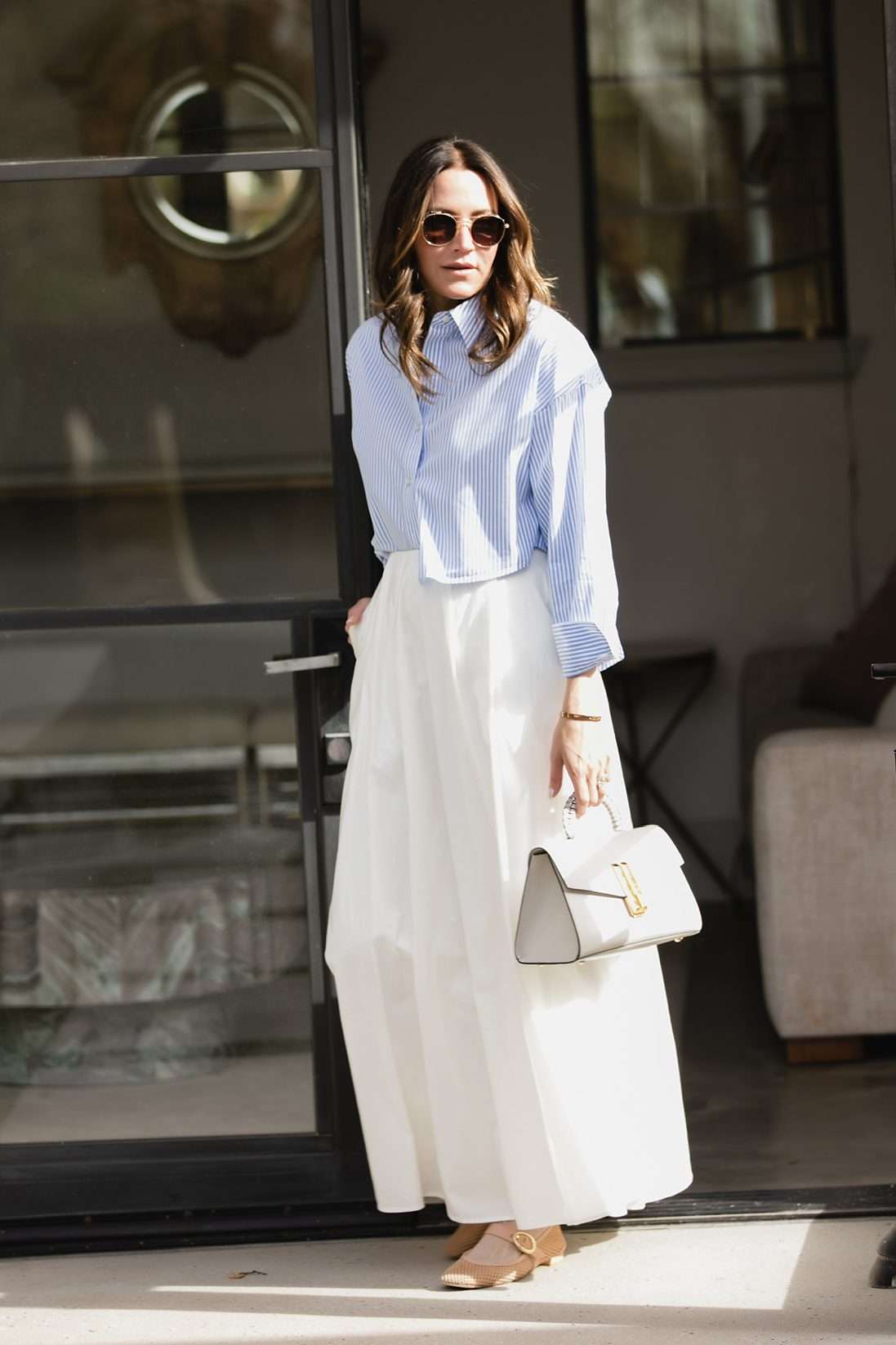 A satin skirt styled with a soft knit creates a beautiful elevated look without feeling overly formal. Add delicate jewelry and heels or flats for a refined touch.