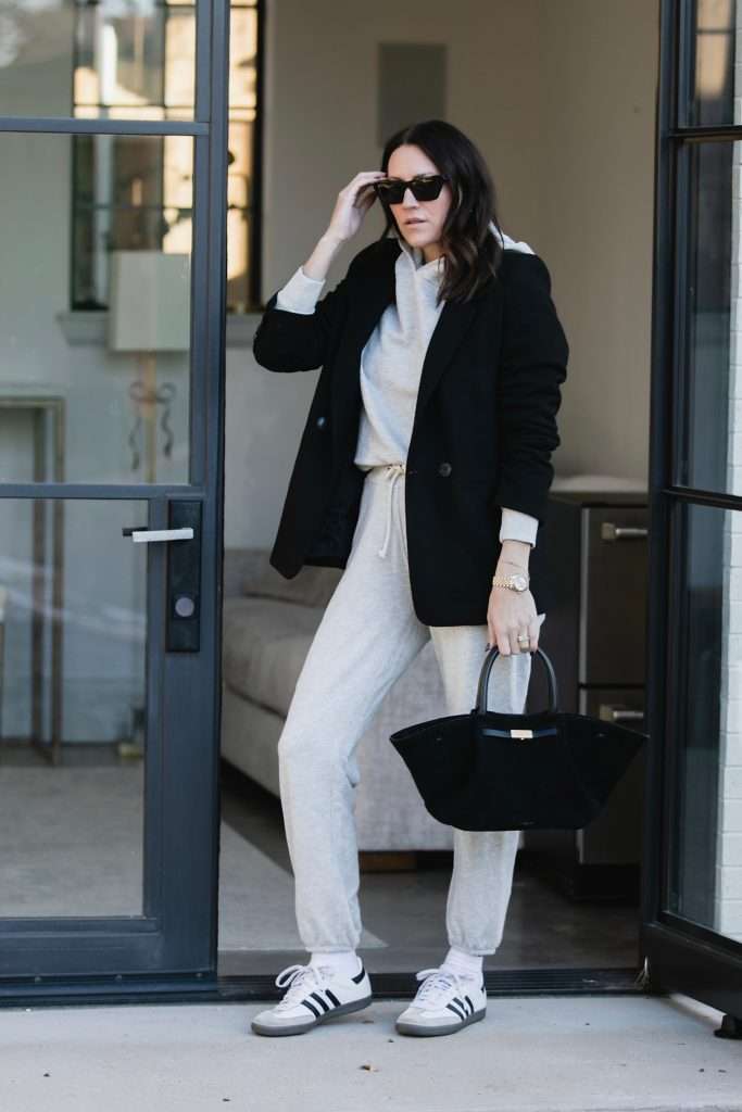 A matching lounge set layered with a structured jacket feels effortless while still looking elevated enough for dinner.