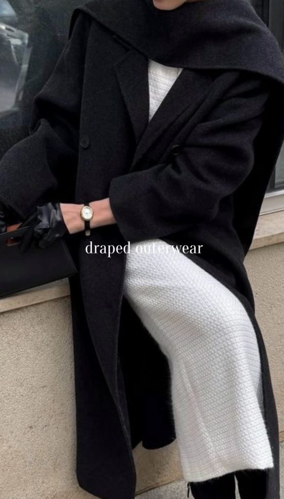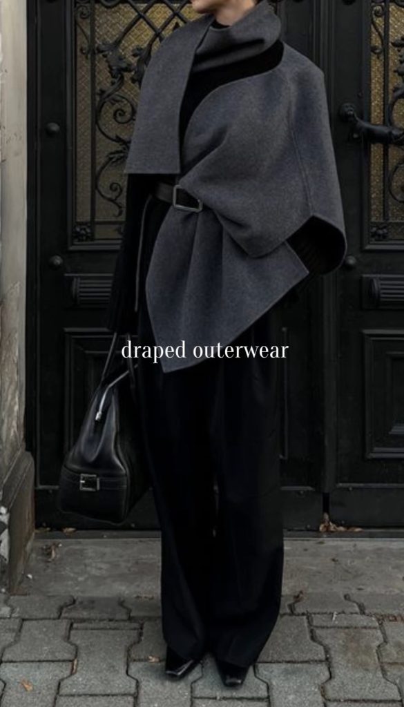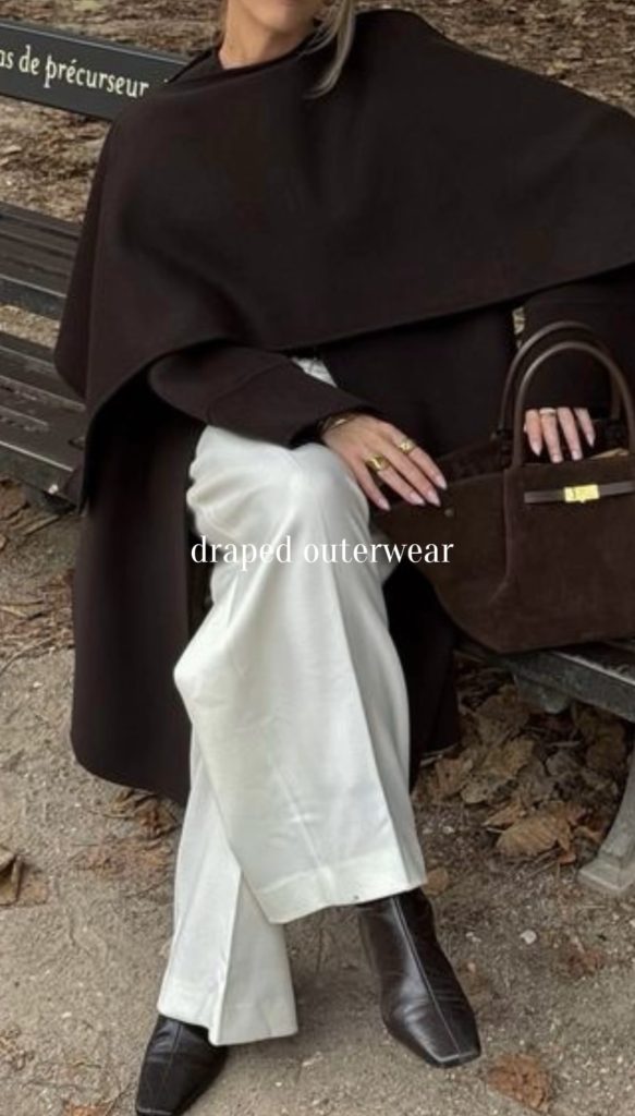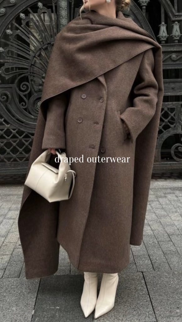 Draped outerwear is having a major moment this winter, bringing an effortless elegance to cold-weather dressing. Think scarf jackets, wrap-style coats, and chic capes. Overall, pieces that naturally flow and drape for a sophisticated, elevated look. These styles add instant polish to even the simplest outfit while keeping you warm and cozy. Whether layered over a sleek knit or paired with tailored trousers, draped outerwear is one of the most refined trends of the 2025–2026 winter season.