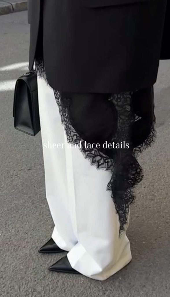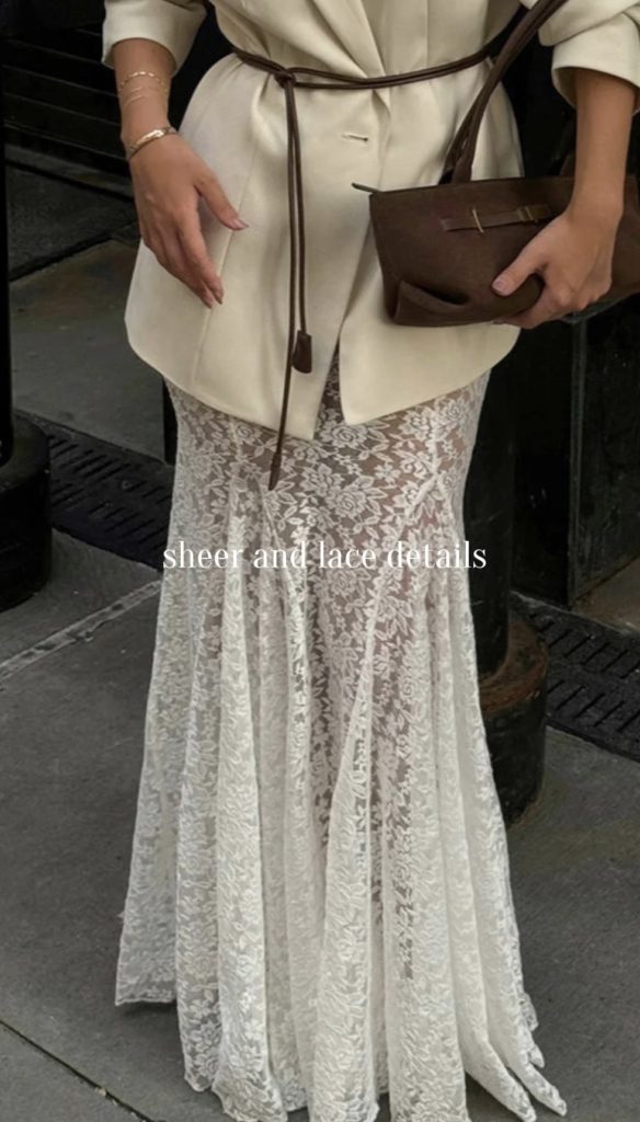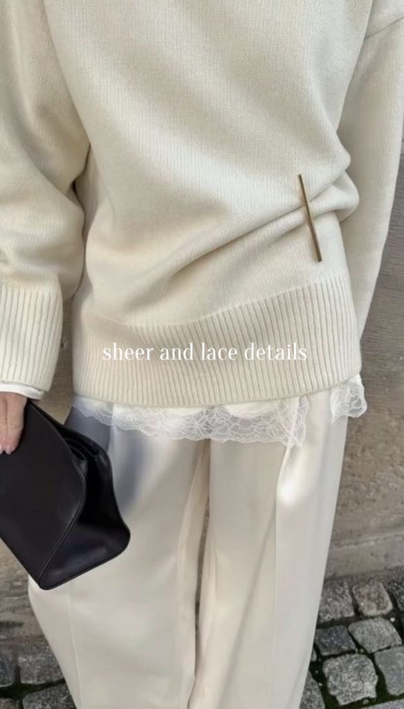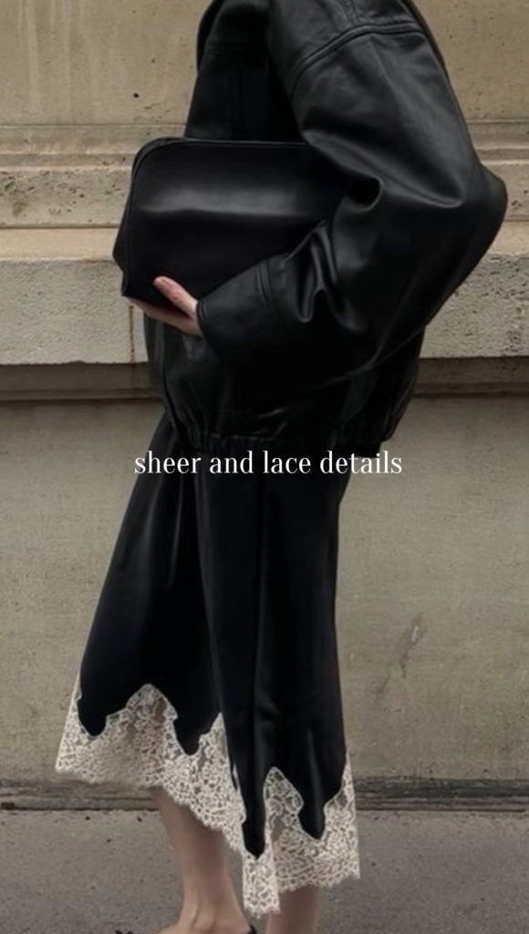 Lace and sheer details are making winter outfits feel softer, feminine, and effortlessly chic this season. Think a delicate lace skirt paired with an oversized blazer, a long lace top subtly peeking out from under a cozy sweater, or a sheer skirt styled with a chunky knit for the perfect balance of contrast. These pieces add texture and romance while keeping your look modern and elevated. It’s an easy way to bring a touch of elegance into your winter wardrobe without sacrificing warmth.