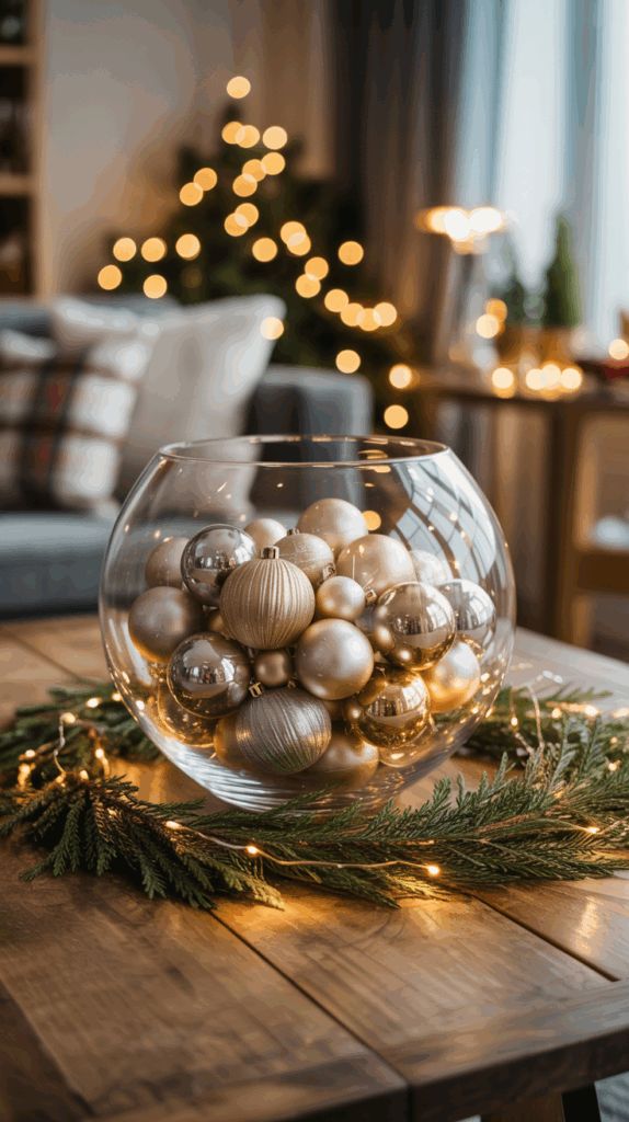 Fill a glass pedestal bowl with crystal ornaments or glass spheres to reflect ambient light.