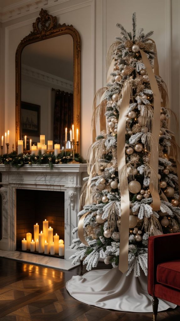 This year, Winter Wonderland styling pairs beautifully with the trending modern organic design approach. For example, think layering natural materials, minimal shapes, and warm neutrals with the shimmer and softness of winter. It also aligns perfectly with the Ralph Lauren Christmas aesthetic that is trending right now: rich textures, refined metallics, white lights glowing against greenery, velvet ribbon, and heirloom-inspired details. And because bows are everywhere this season, from fashion to interiors, this post incorporates inspiration for adding ribbon and bow accents in a fresh and elevated way. These simple touches recreate that soft, glowing feeling you’d experience walking through Hyde Park during the holidays.