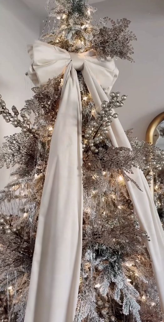 Flocked branches, pearl-colored ornaments, metallic ribbon, and velvet bow toppers are overall such clean, quiet, and refined additions to your tree.