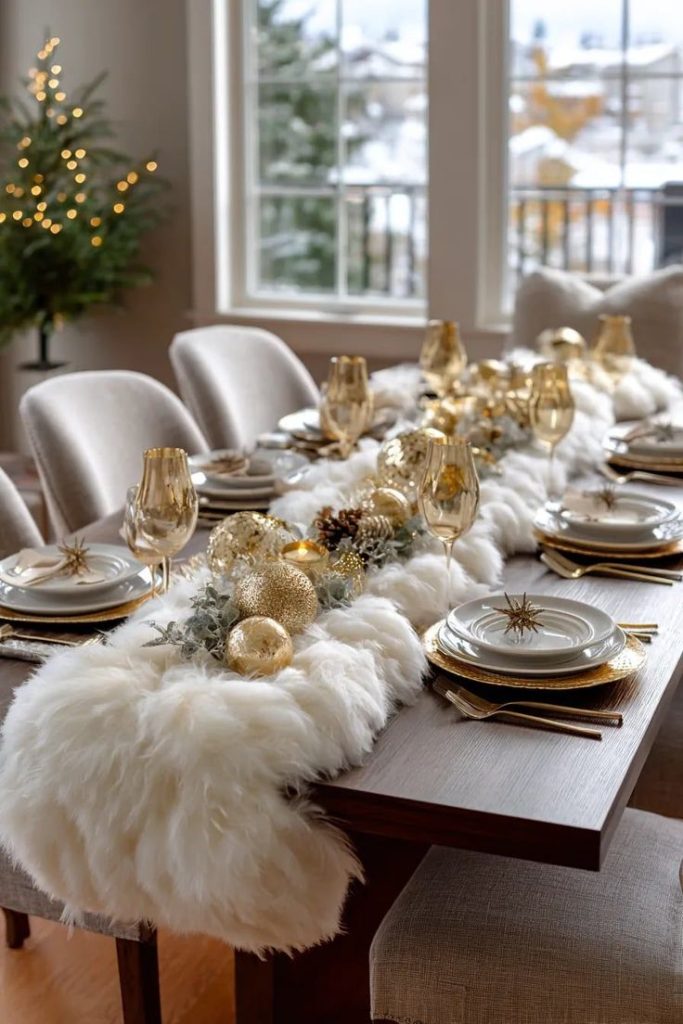 Use chiffon, faux fur or tulle layered with greenery, candles, and ornaments for snowfall texture down the table center.