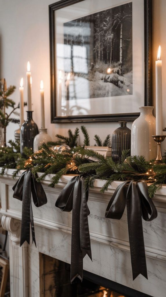 Velvet ribbon bows tied on wreaths, garlands, stockings, sconces, and chair backs feel soft, feminine, and elevated without being overly decorated.