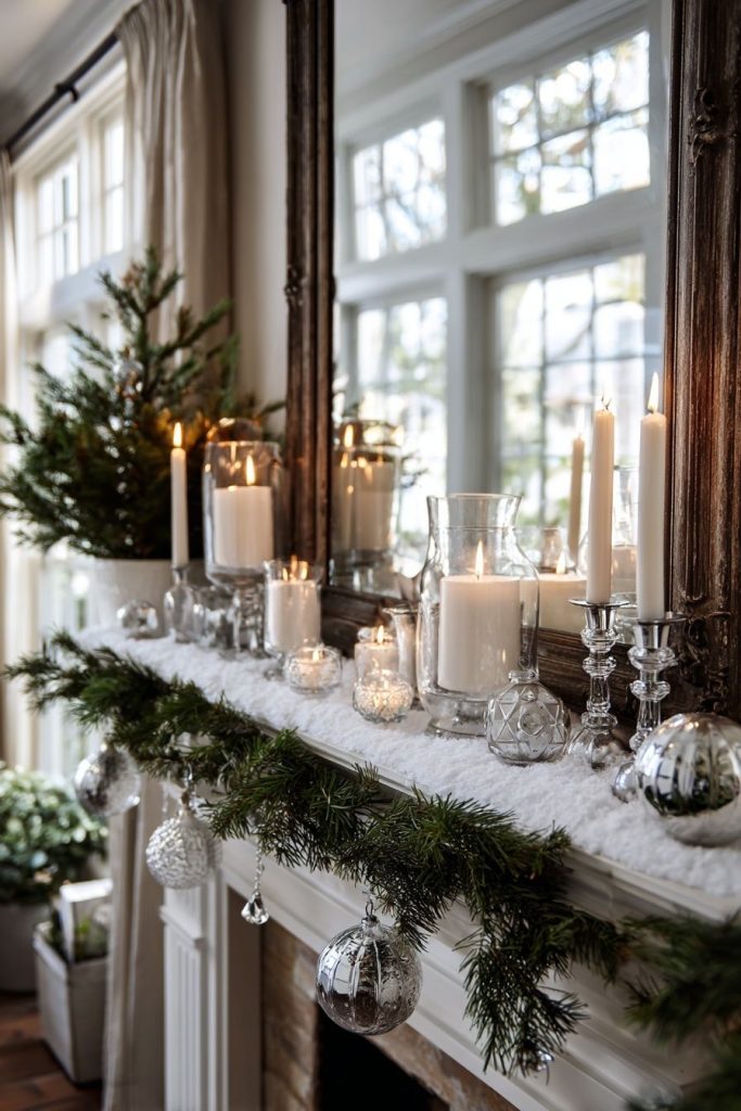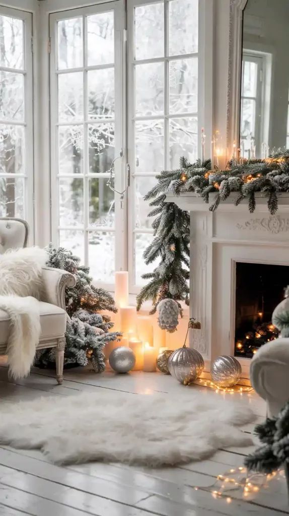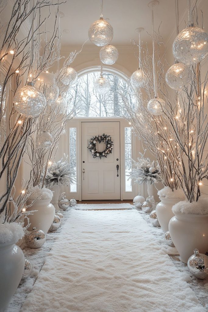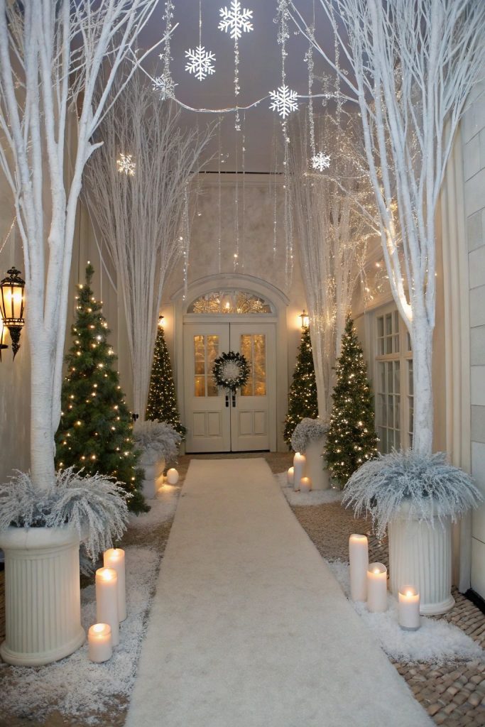 Flocked garlands, frosted branches, and soft white lights create a magical greeting moment. Also, try layering lanterns at varying heights for glow.