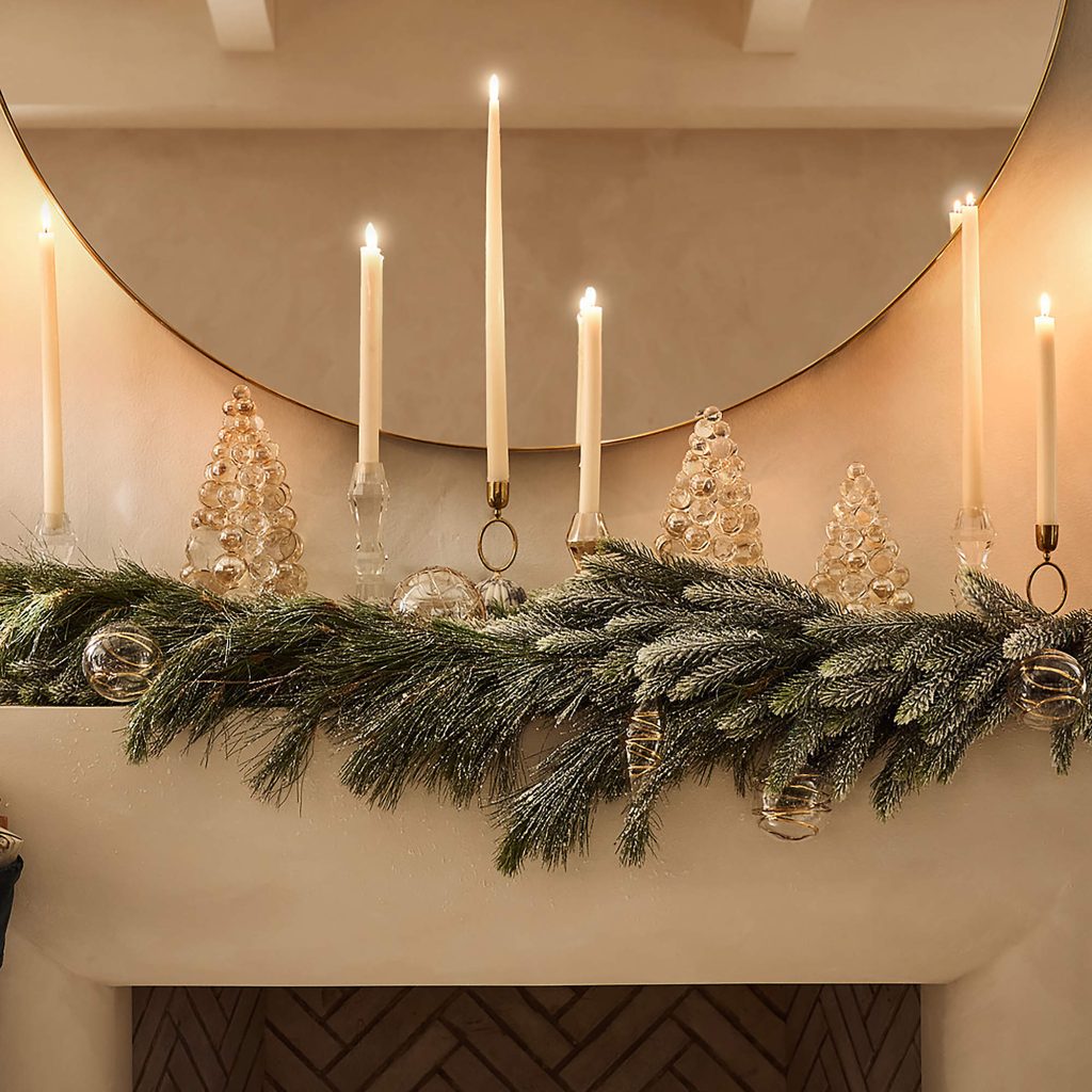 Layer garland with natural stems, ceramic vases, stone candle holders, and twinkle lights for a sculptural organic feel to your mantle.